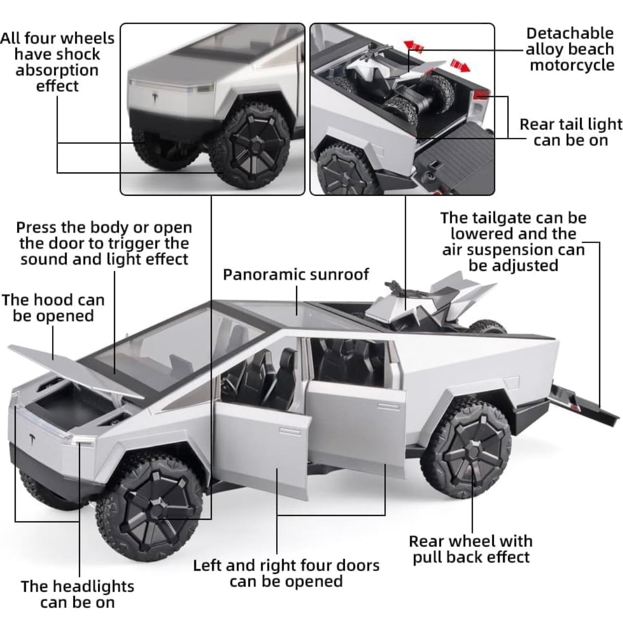 1:24 Tesla Cybertruck Pickup with Motorcycle – Diecast Alloy Toy Car with Lights & Sound