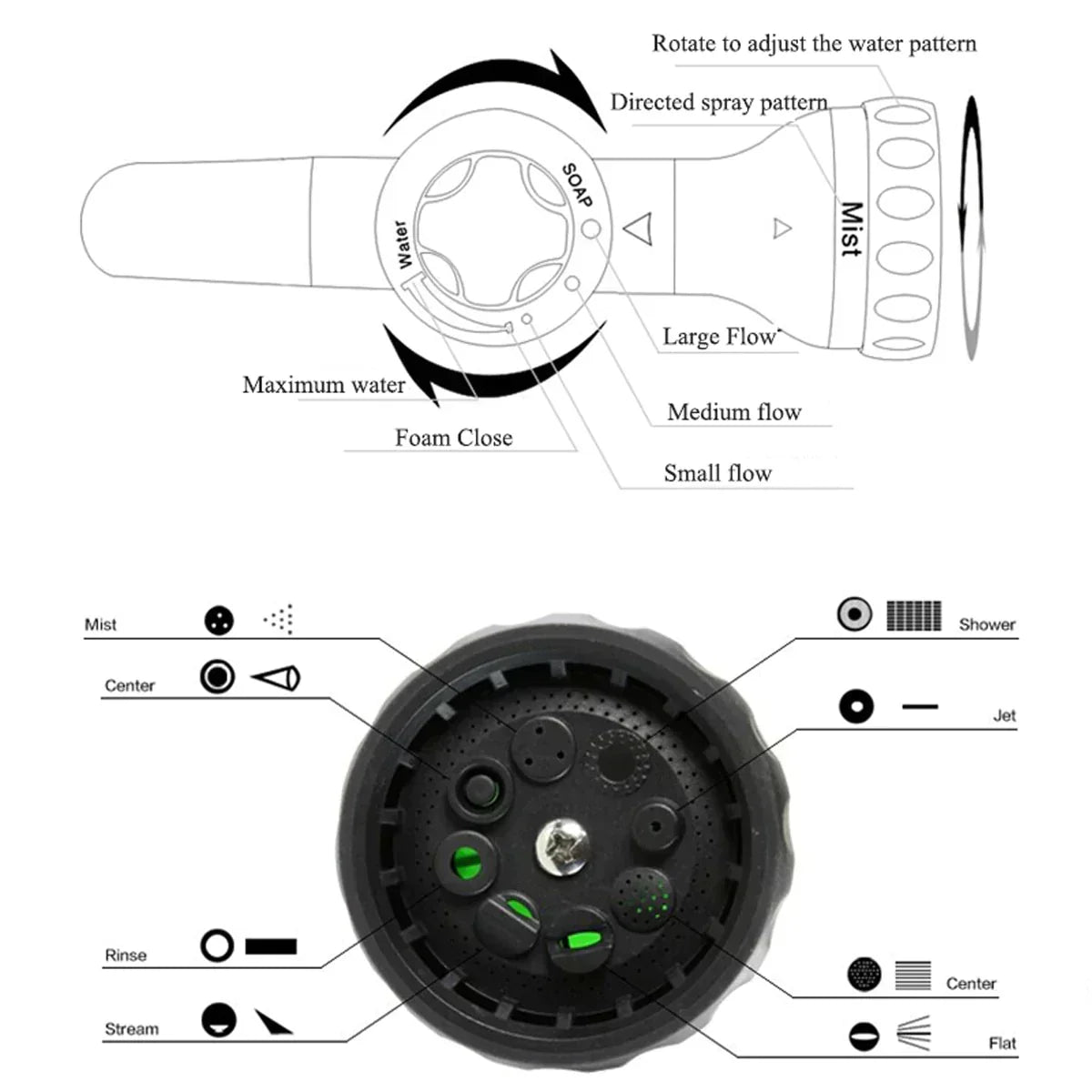 The car wash hose nozzle has 8 spray patterns and a built-in soap dispenser. New design technology concentrates water pressure to one point, with a spray distance of 6-10 meters! 🌊